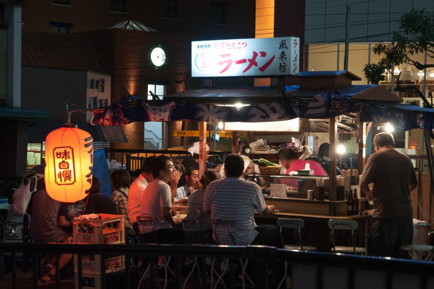 Fukuoka’s Yatai (street food stalls) are famous. At night they can be found at various locations in the city but the greatest concentration is along the river. People flock there in masses to have a bowl of noodle soup, or some drink and the atmosphere is lively. Friends talk to each other, strangers talk to each other and sometimes become friends.